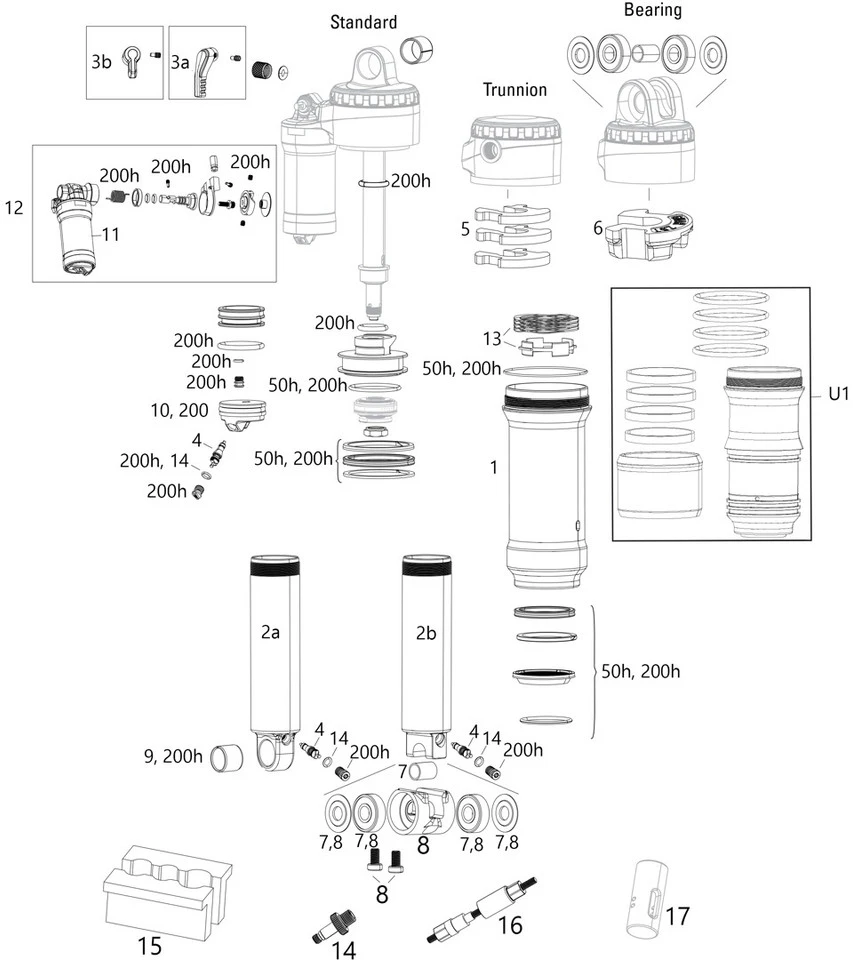 Service Kit 200 Stunden/1 Jahr für Super Deluxe (A1-B2, 2017-2020) Dämpfer, mit Luftkammerdichtungen, Kolbendichtung, Führungsringen, IFP-Dichtungen, Ausgleichsbehälter-Dichtungen, Dichtungsfett/-öl